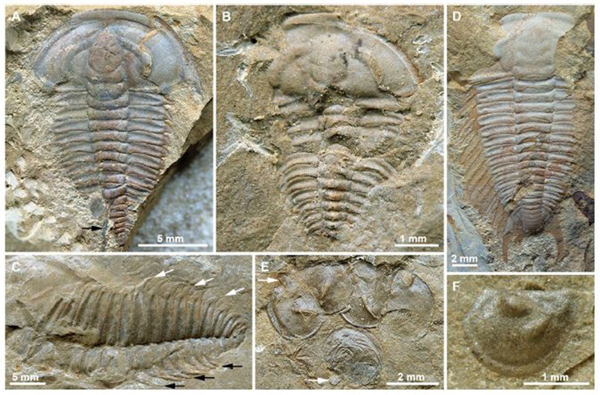 图2寒武系第三阶范店生物群的标准化石。 (A–D) 三叶虫:(A) 始莱德利基虫(Eoredlichia); (B, C) 武定虫(Wutingaspis); (D) 张山虫(Zhangshania); (E,F) 高肌虫:(E) 昆明虫(Kunmingella); (F) 高桥虫(Gaoqiaoella)。
