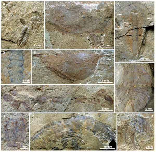 图3. 寒武系第三阶范店生物群的节肢动物。 (A) 不同生长期的武定虫(Wutingaspis)个体; (B) 吐卓虫(Tuzoia); (C, D) 保存有消化盲管、消化腺和肠道的Naraoia。 (E) 等刺虫(Isoxys)(F) 三叶形虫 Xandarella。 (G, H) 呈链状保存的原虾(Primicaris)。(I) 奇虾捕食前肢。 (J) 捕食肢末端。