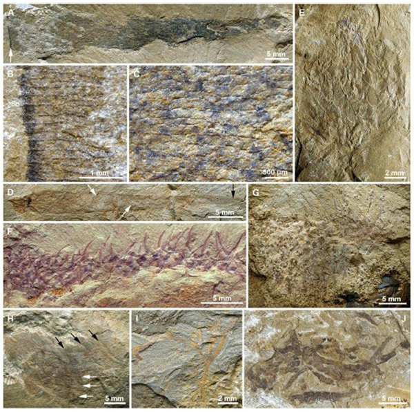 图1. 寒武系第三阶范店生物群的表生生物。(A–C) 海绵。(D) 寻常海绵(demonsponges)。(E–G) 开腔骨(chancelloriids)。(H) 貌似伊尔东(Eldonia)的动物残留。(I, J) 丝状藻类。