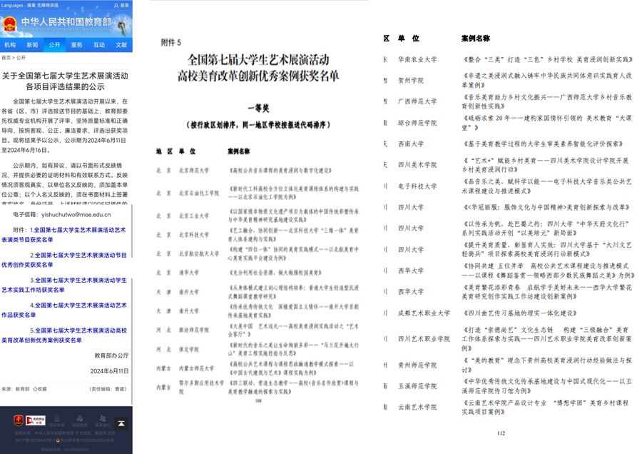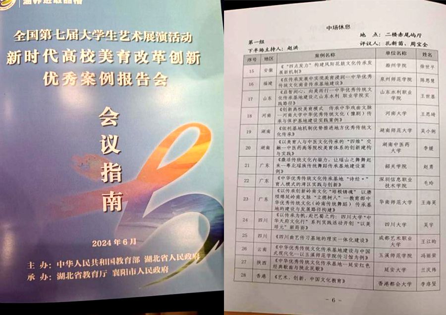 2024年6月11日,我校湄公河次区域民族民间文化传习馆(以下简称传习馆)副馆长冯丽荣老师的美育案例《中华优秀传统文化传承基地建设与中国式现代化—以玉溪师范学院传习馆为例》,荣获由教育部举办的全国第七届大学生艺术展演新时代高校美育改革创新优秀案例一等奖,并应邀赴湖北襄阳参加全国第七届大学生艺术展演现场展演。