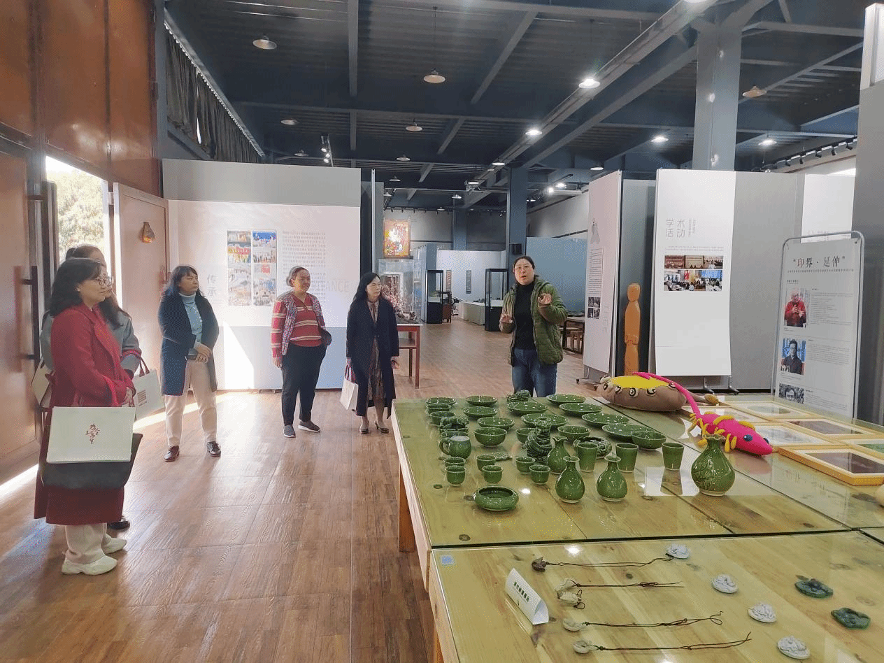 传习馆作为云南省内知名的传统文化传承及科普教育基地,一直以来都致力于传统文化的传承与创新。此次参观由传习馆王美佳老师接待讲解,王老师带来宾们参观了传习馆的各个展厅,包括公共美育空间、木雕传习室、陶艺工作室、民间版画展区、古生物展厅以及正在进行的“印界·延伸”云南民族民间木版画传统技艺与现代创意艺术作品展,并详细介绍了传习馆的历史背景、文化传承以及在教学、科研等方面的特色与成就。