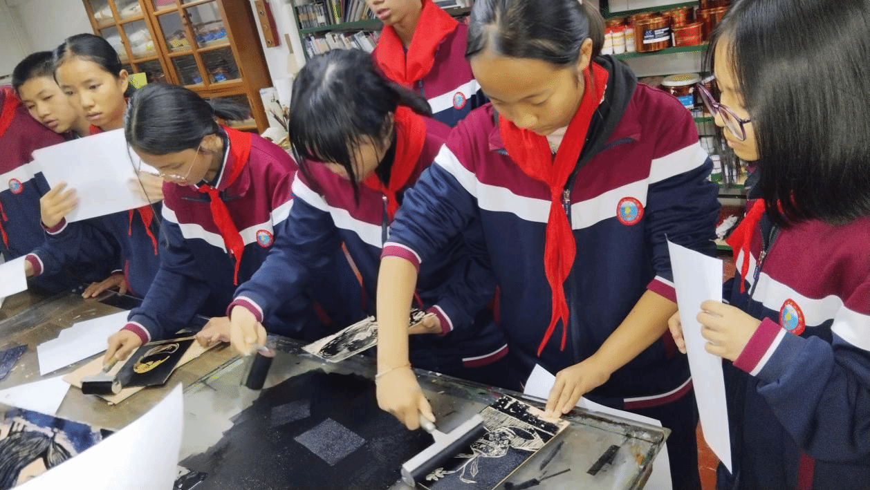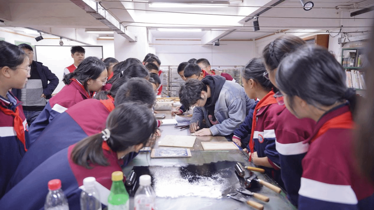 在传习馆单平老师的带领下,同学们首先体验了非遗木刻版画制作。单老师首先向大家讲解了木刻版画的起源、发展历程和基本技法,并就版画制作过程进行示范。在单老师的指导下,六中学子们进行版画制作体验,亲手雕刻印压版画作品,并进行作品展示与学习心得交流。