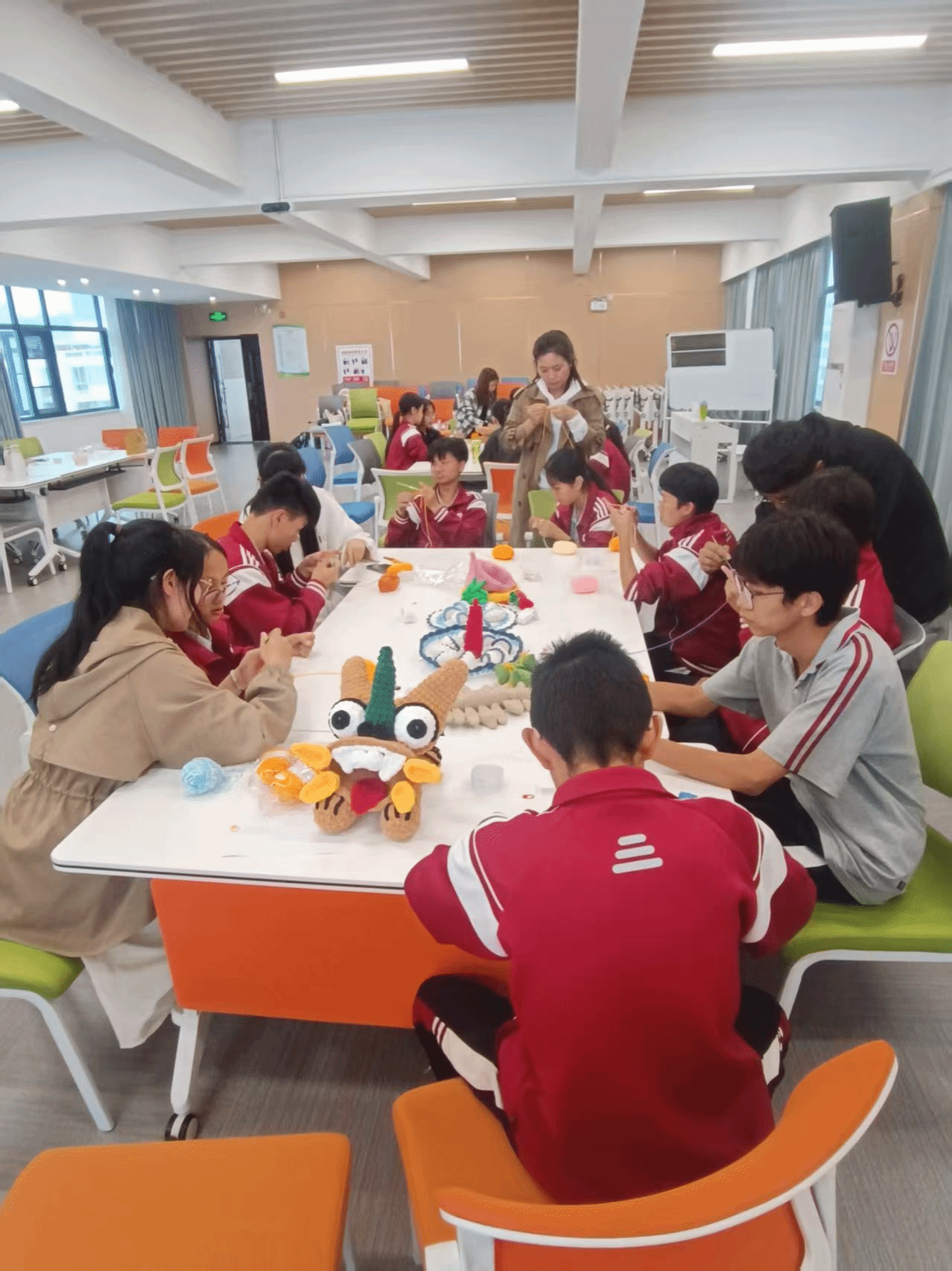 活动伊始,冯丽荣老师介绍本次项目活动的主要内容、学习要求和学习意义所在。随后,学生志愿者们按事先分好的小组,分别进入到听障七年级、九年级、高一年级和视障高三年级及家长群中,分发工具和材料,展开活动,成为非遗传承的小老师。他们耐心细致地给同学们讲解钩编的基本针法和钩编技巧,从起针到每一个针法的变化,都手把手地进行示范。同学们眼中充满了专注、好奇与渴望,持针的手不停地、努力地跟着志愿者的动作比划。尽管动作稍显迟缓,但执着专注和不服输的劲头让人动容。在志愿者们的鼓励和帮助下,同学们逐渐掌握了基本的钩编针法,一件件稚嫩却充满心意的小作品在他们的手中慢慢成型。